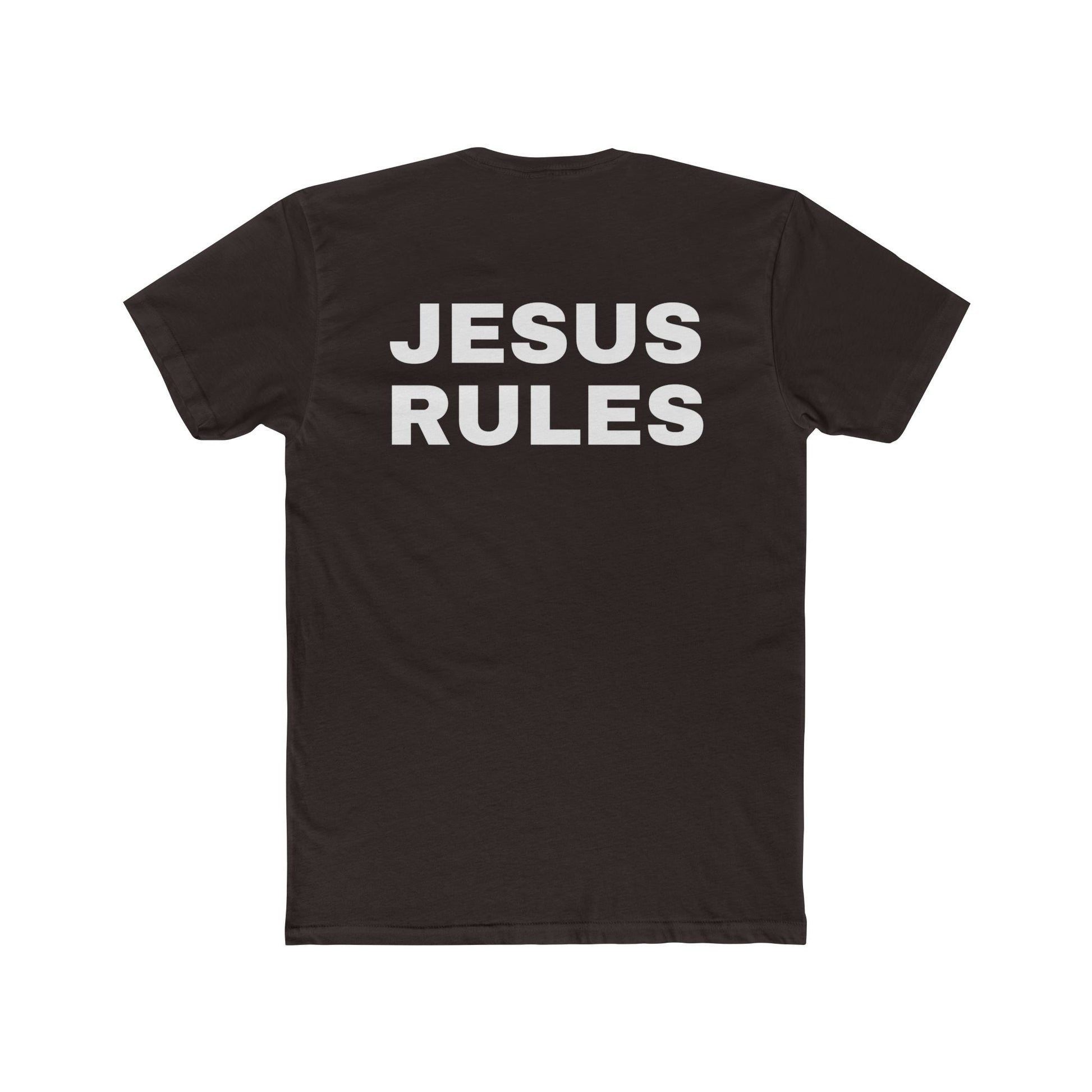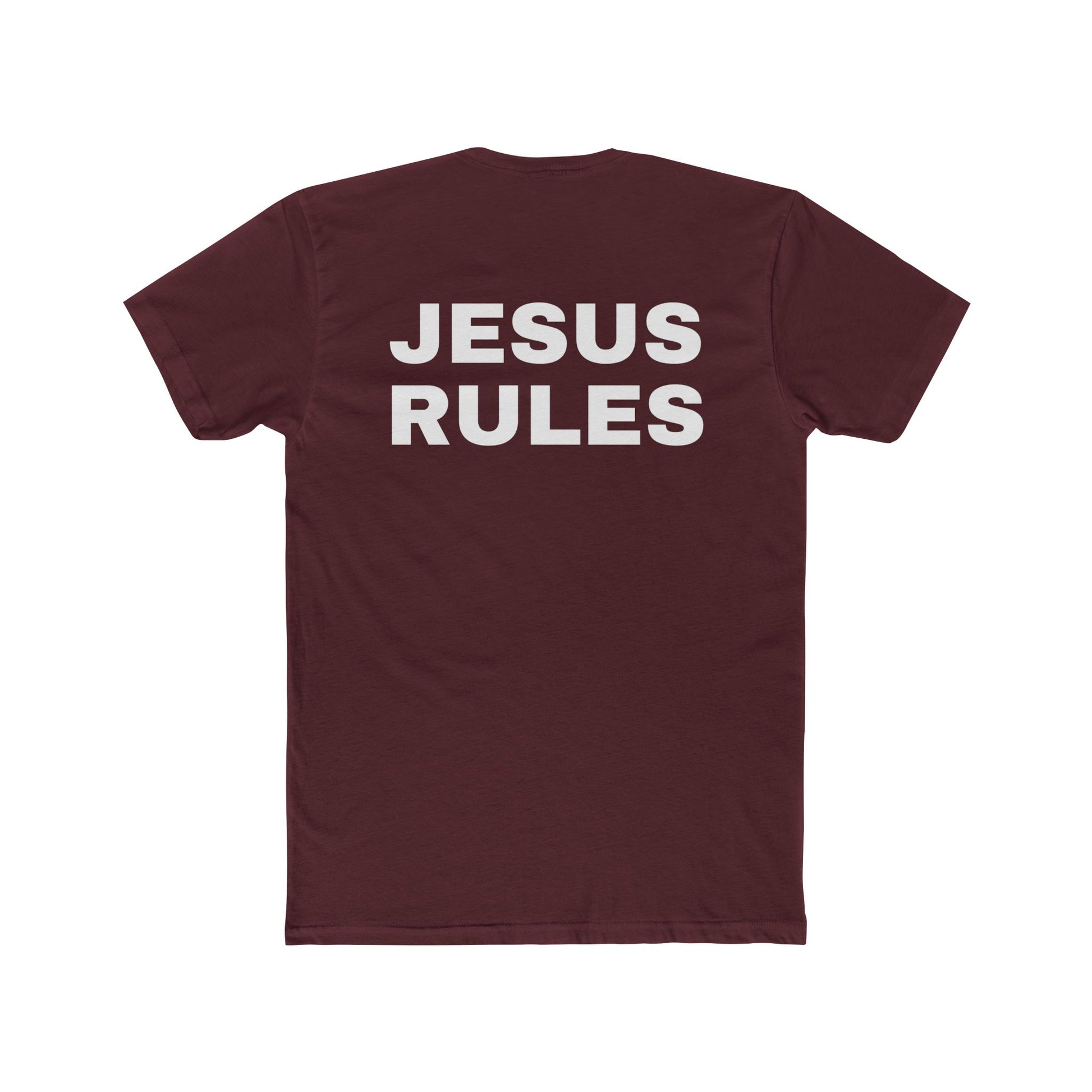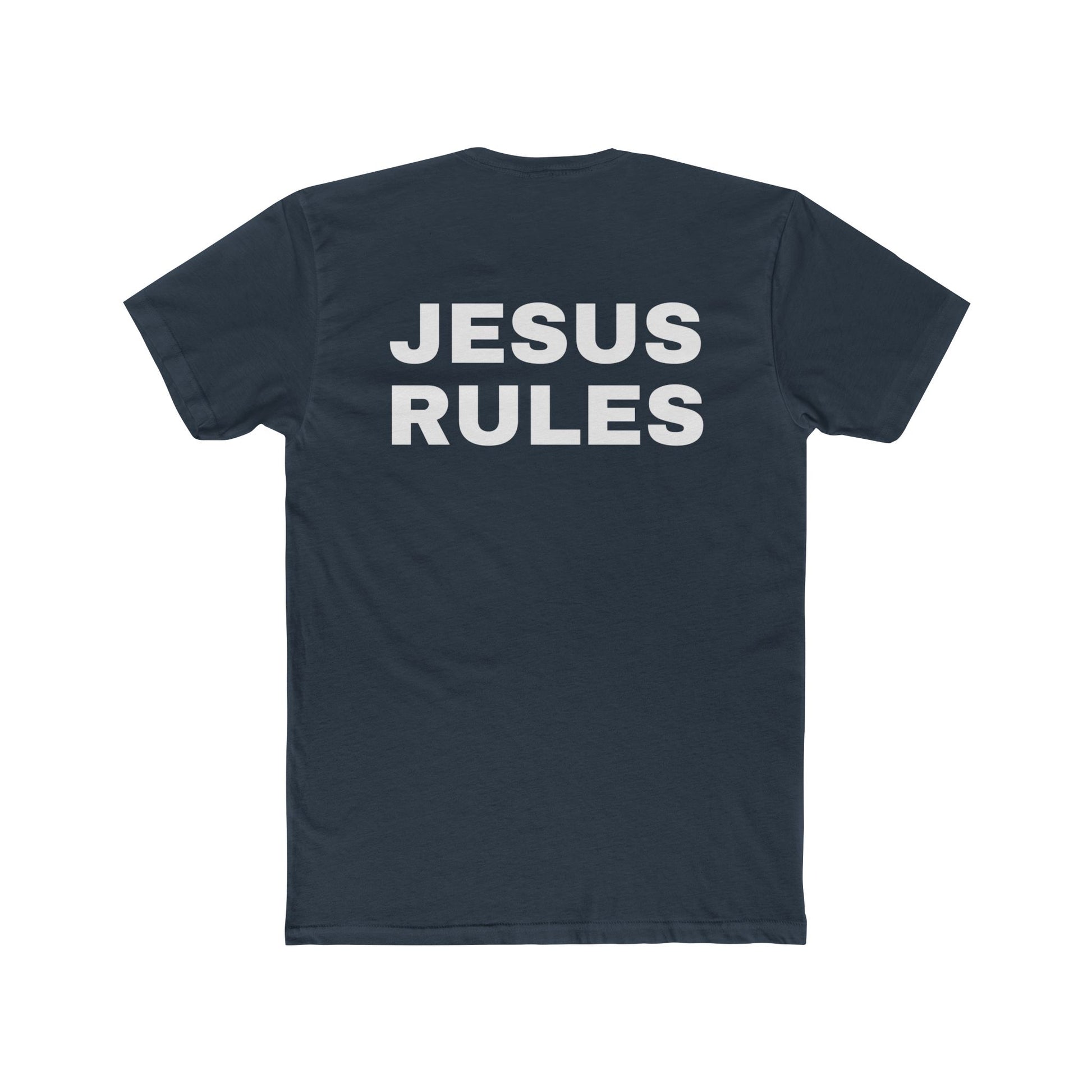 A soft, lightweight cotton crew tee designed to quietly proclaim faith with confident simplicity. A clean cross sits on the chest while bold, block-letter text across the back reads “JESUS RULES,” making a calm yet unmistakable statement. The classic crew neckline and regular fit let this tee layer easily under jackets or stand on its own. It wears comfortably through seasons and holds its shape thanks to ribbed collar, shoulder tape, and side seams. Printed with durable Direct-to-Film ink for long-lasting clarity, this shirt is made for everyday moments of worship, outreach, or fellowship — from coffee shop conversations to Sunday gatherings. Subtle in front, declarative in back: it balances reverence with approachable style.