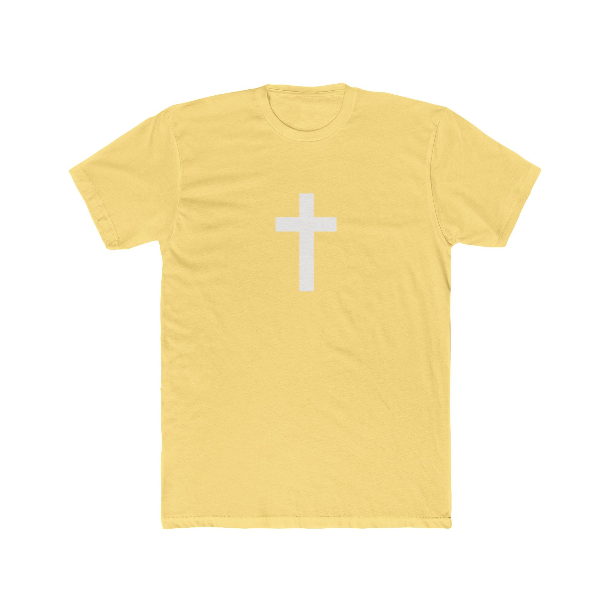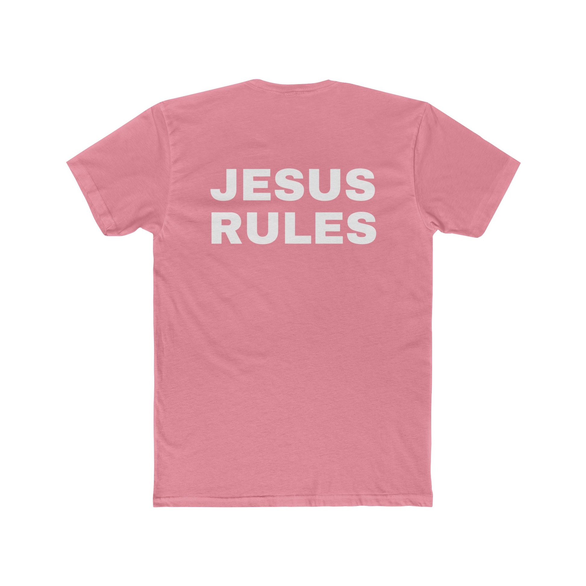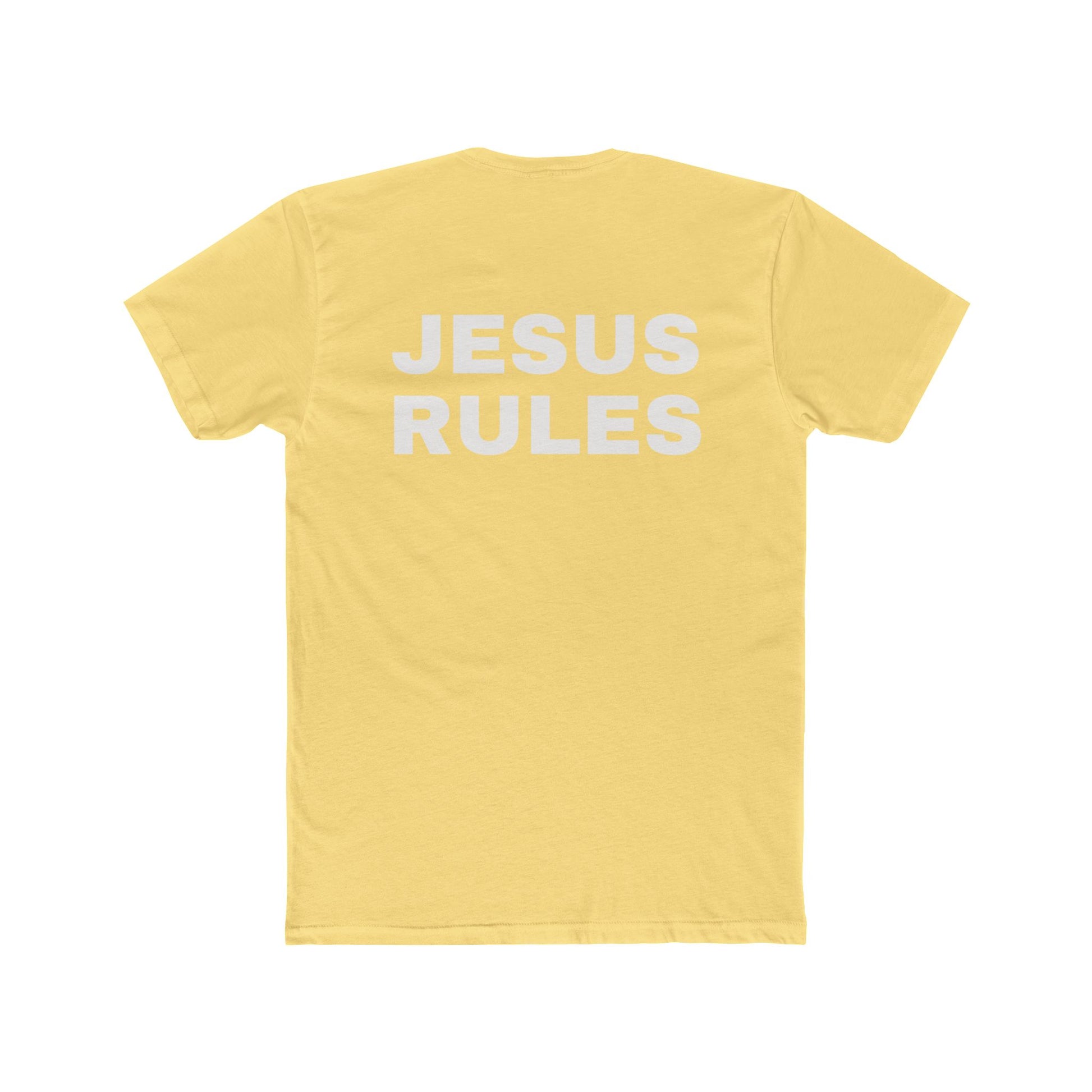 A soft, lightweight cotton crew that carries faith with quiet confidence. The front wears a simple cross — minimal, steady — while bold block letters across the back read JESUS RULES, turning a humble tee into a clear devotional statement. It drapes easily over jeans or layered under a jacket, moving from weekday routines to church gatherings with low-key authority. Breathable, true-to-size, and subtly styled, this shirt fits into the wardrobe of someone who wants to share belief without shouting, and who prefers honest, straightforward design over fuss.